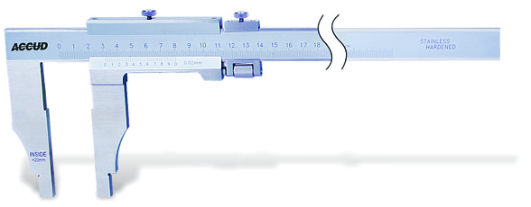 A long version Vernier caliper with no upper measuring jaws is a specialized precision measuring tool designed for accurate linear measurements over extended ranges. Unlike traditional calipers, this model lacks the upper jaws, allowing for unobstructed measurements of large objects or materials with non-standard shapes. The main scale is graduated in millimeters and inches.
